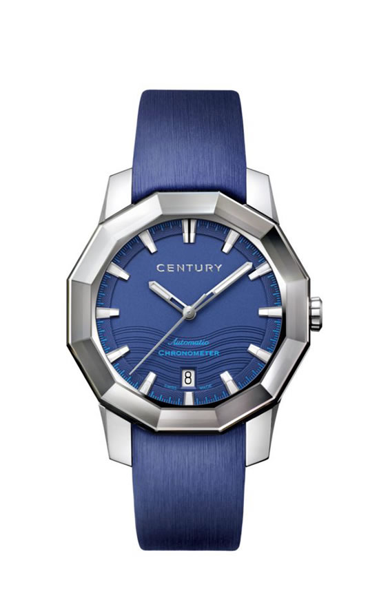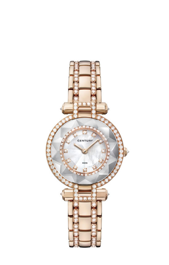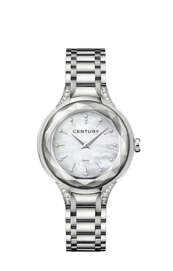 精钢表带和圆润的边角守护着CENTURY世纪蓝宝石表壳,48个手工切割和抛光的刻面。呼应着12个精致纤细,映衬着白色珍珠母贝的泪滴形时标刻度。